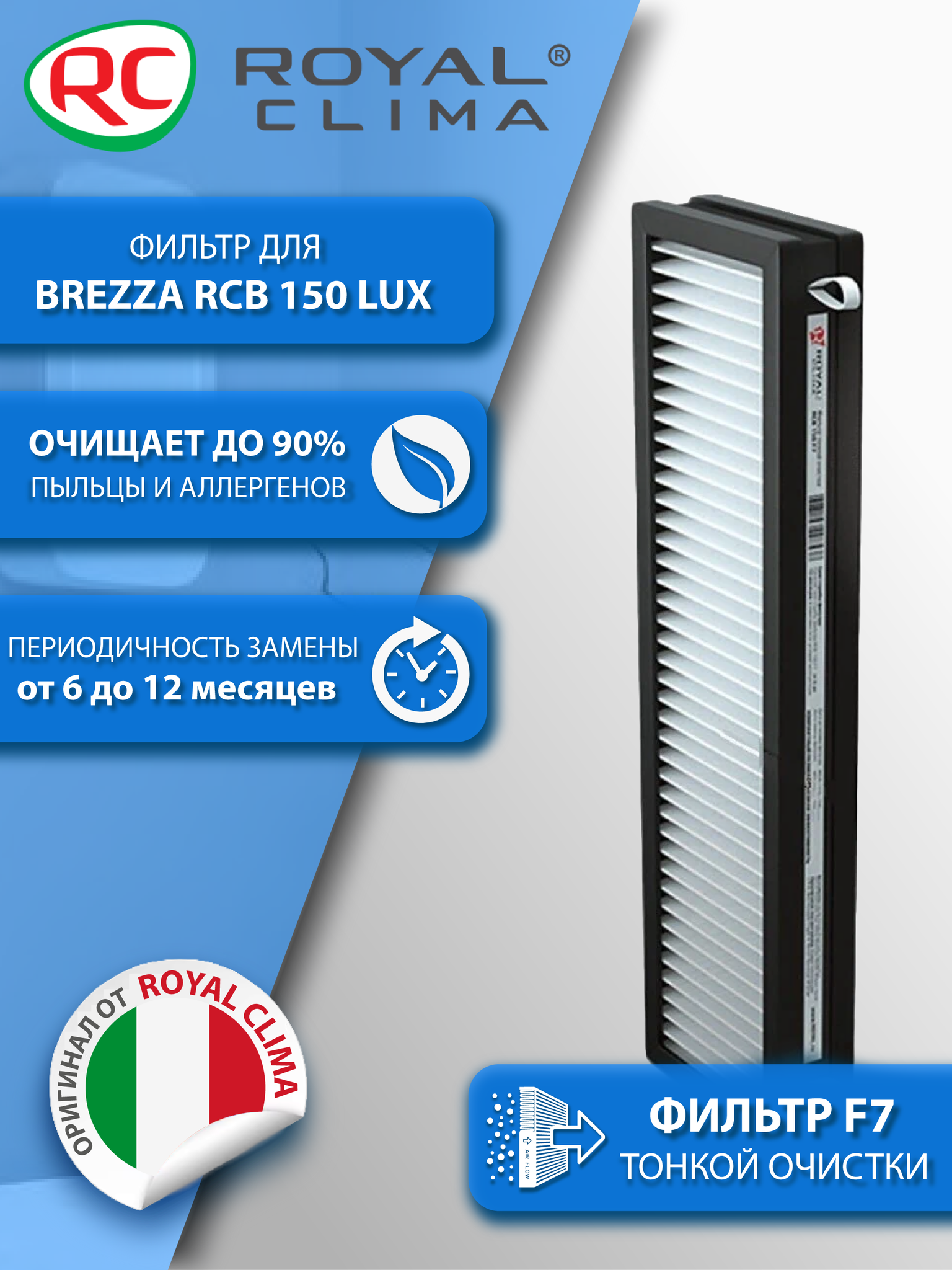 Фильтр тонкой очистки F7 для установки в ROYAL CLIMA Brezza RCB 150 Lux. Фильтр тонкой очистки F7 задерживает частицы размером меньше 0,4 мкм со средней эффективностью 90%. Фильтр F7 способен задержать такие частицы как: частицы краски, ржавчины, пыль среднего и мелкого размера, частицы стекла, а также пух и пыльцу некоторых растений.