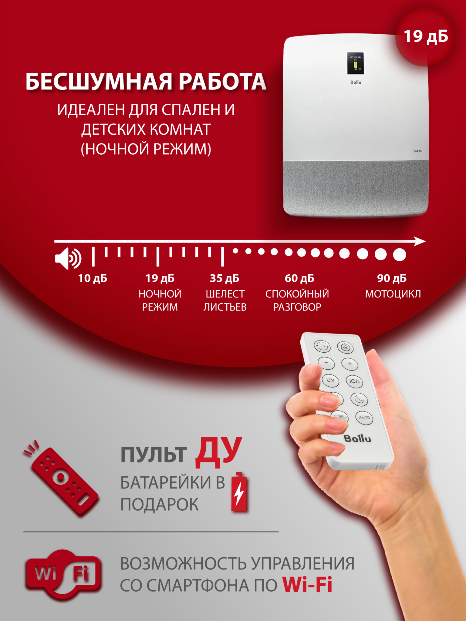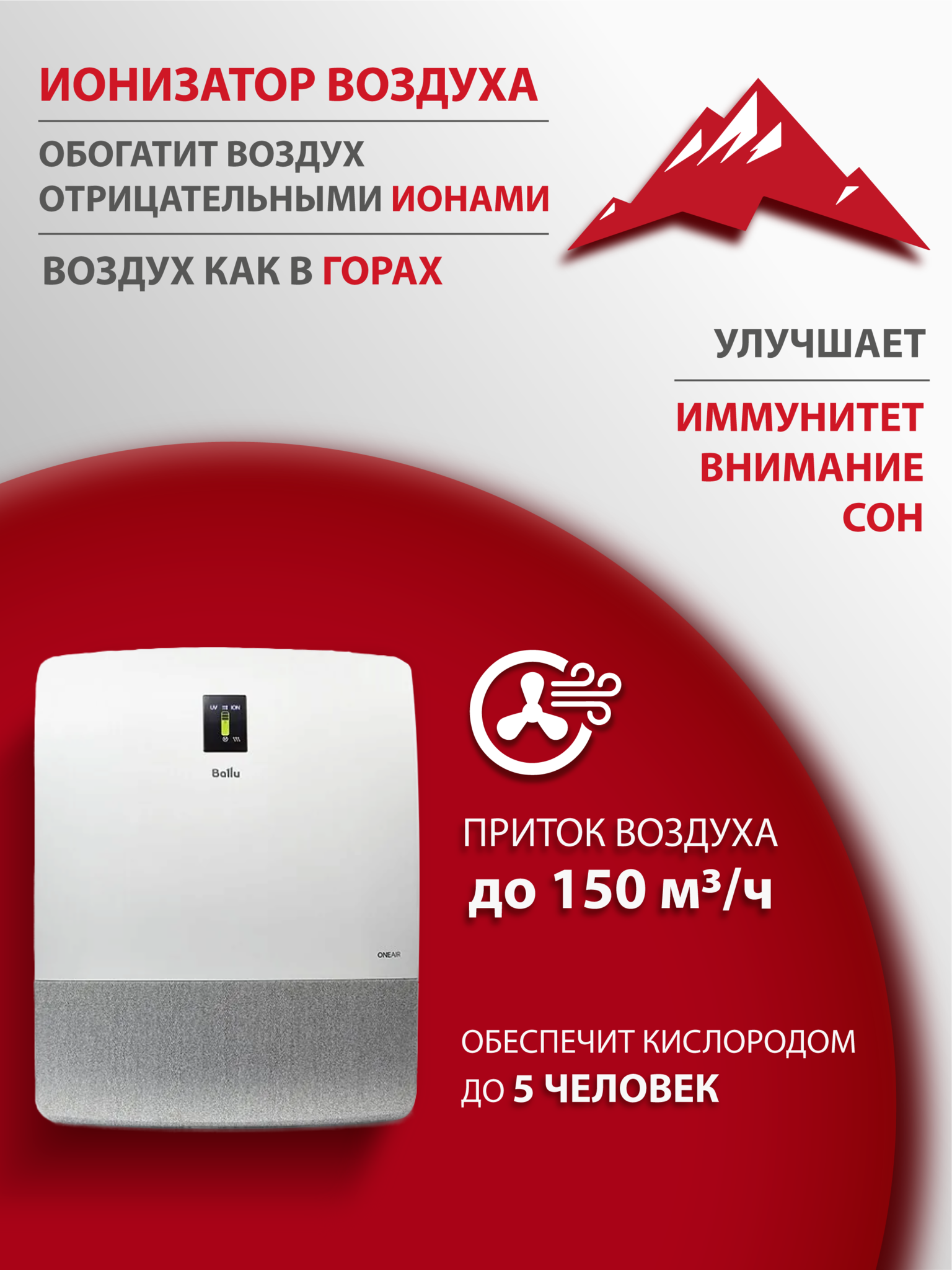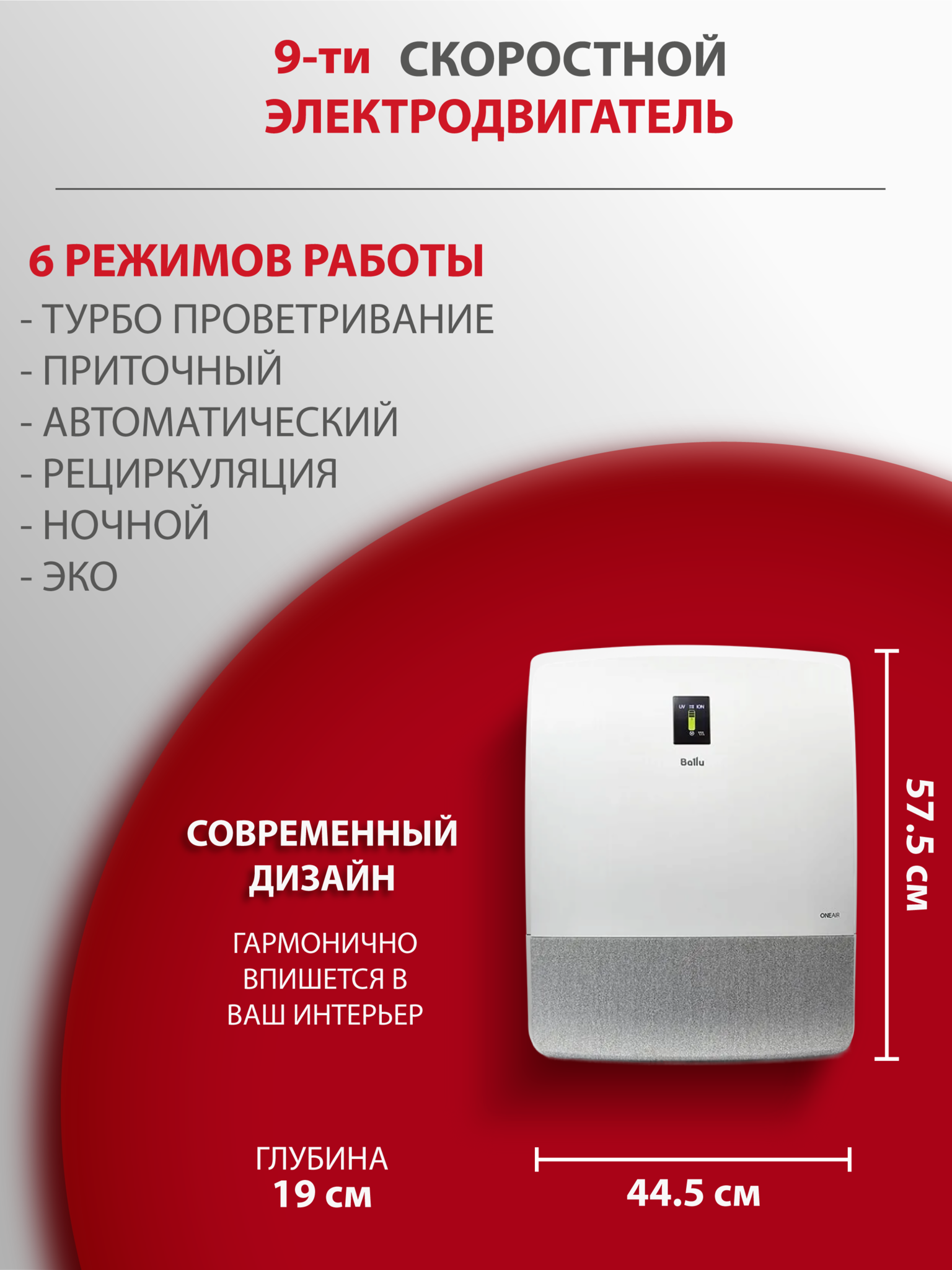 Ballu ONEAIR ASP-200S – инверторный приточный очиститель воздуха с интеллектом. Предназначен для подачи свежего и очищенного воздуха в любые жилые помещения площадью до 75 кв.м. Встраиваемый высокоэффективный керамический нагревательный элемент мощностью 1200 Вт (опция, приобретается отдельно) подогревает входящий воздух. При этом прибор эффективно работает в осенне-зимний период при температуре наружного воздуха до -40°С. Профессиональная система очистки воздуха, состоящая из 6 ступеней, устраняет 99,9% загрязнений в воздухе, поглощает неприятные запахи, обеззараживает от вирусов и бактерий. В приборе есть арома-капсула для масел, позволяющая создать индивидуальную атмосферу на любой вкус. Встроенный датчик РМ2,5 в зависимости от качества воздуха автоматически управляет интенсивностью очистки в режиме циркуляции. Датчик CO2 (опция) контролирует уровень углекислого газа в помещении и автоматически управляет клапаном притока, поддерживая оптимальный уровень CO2. Прибор имеет удобный интерфейс, который обеспечивают цветной дисплей и полифонический звуковой сигнал, встроенный Wi-Fi модуль для удаленного управления прибора с мобильных устройств, пульт ДУ в комплекте.