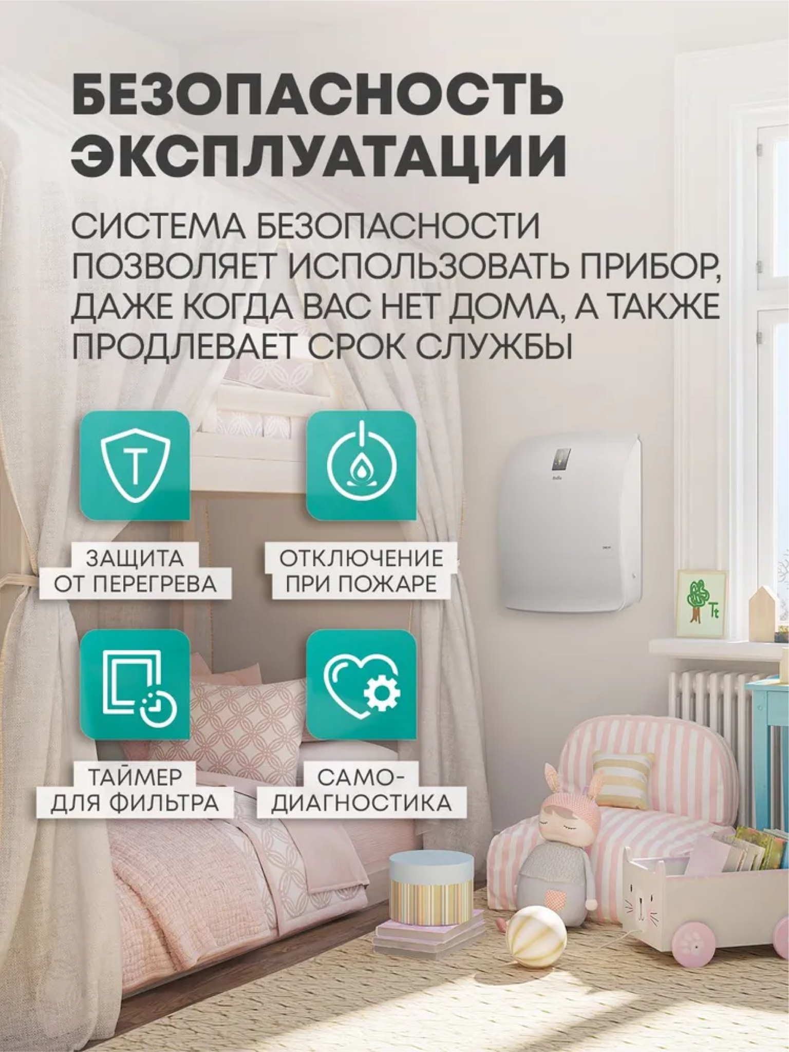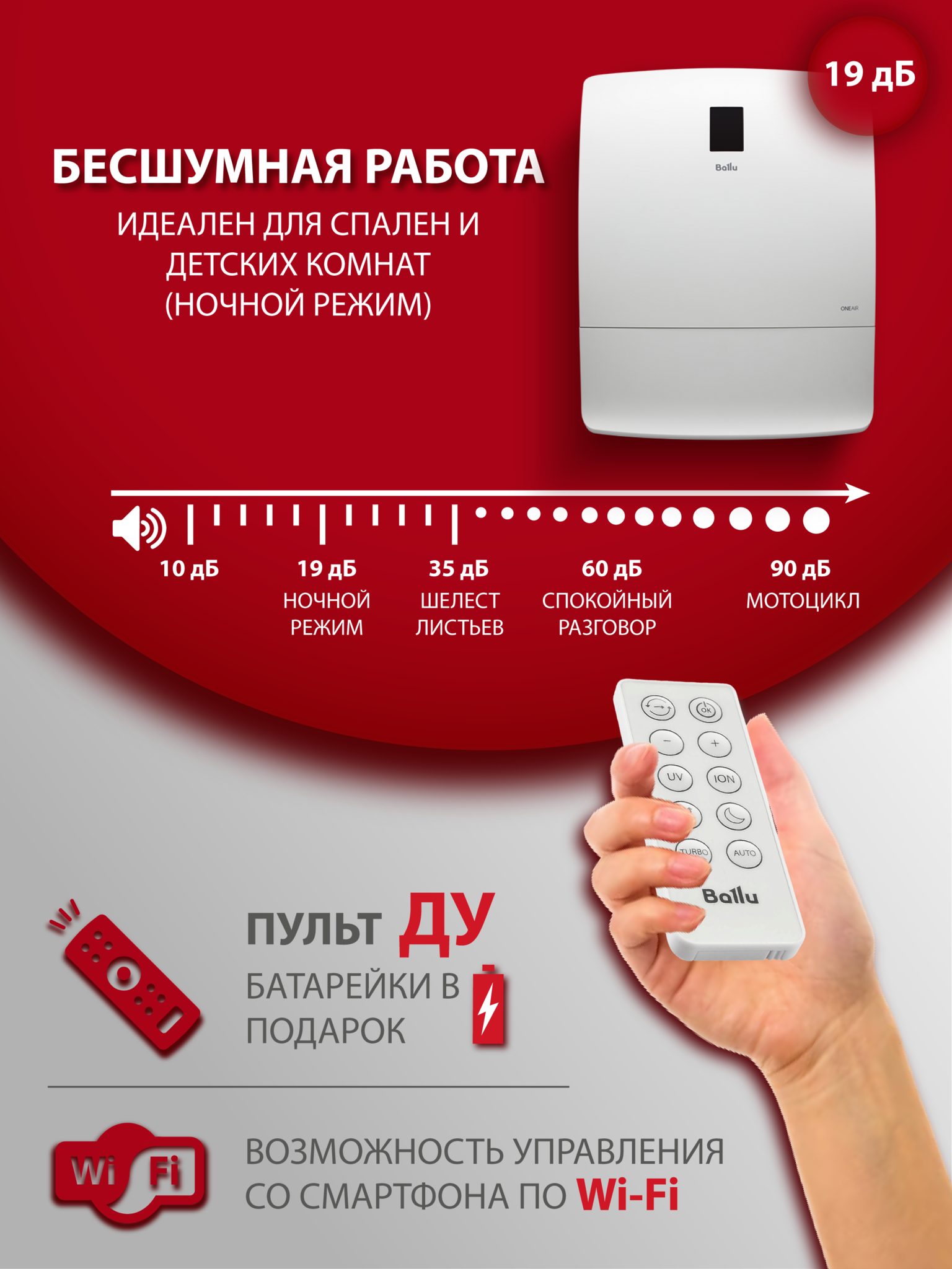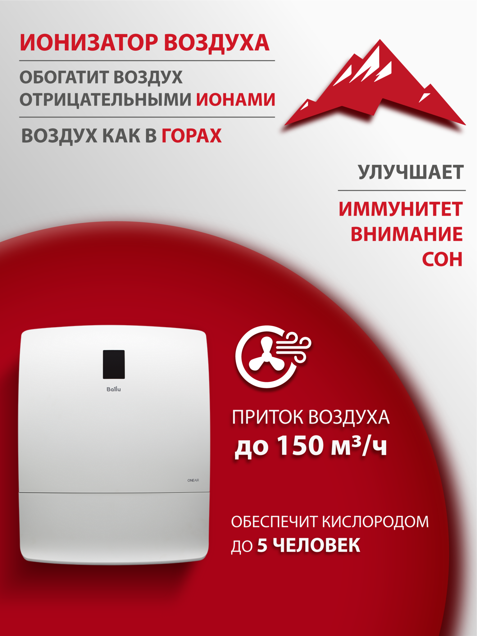 Ballu ONEAIR ASP-200SP – инверторный приточный очиститель воздуха с интеллектом. Предназначен для подачи свежего и очищенного воздуха в любые жилые помещения площадью до 75 кв.м. Встраиваемый высокоэффективный керамический нагревательный элемент мощностью 1200 Вт (опция, приобретается отдельно) подогревает входящий воздух. При этом прибор эффективно работает в осенне-зимний период при температуре наружного воздуха до -40°С. Профессиональная система очистки воздуха, состоящая из 6 ступеней, устраняет 99,9% загрязнений в воздухе, поглощает неприятные запахи, обеззараживает от вирусов и бактерий. В приборе есть арома-капсула для масел, позволяющая создать индивидуальную атмосферу на любой вкус. Встроенный датчик РМ2,5 в зависимости от качества воздуха автоматически управляет интенсивностью очистки в режиме циркуляции. Датчик CO2 (опция) контролирует уровень углекислого газа в помещении и автоматически управляет клапаном притока, поддерживая оптимальный уровень CO2. Прибор имеет удобный интерфейс, который обеспечивают цветной дисплей и полифонический звуковой сигнал, встроенный Wi-Fi модуль для удаленного управления прибора с мобильных устройств, пульт ДУ в комплекте.