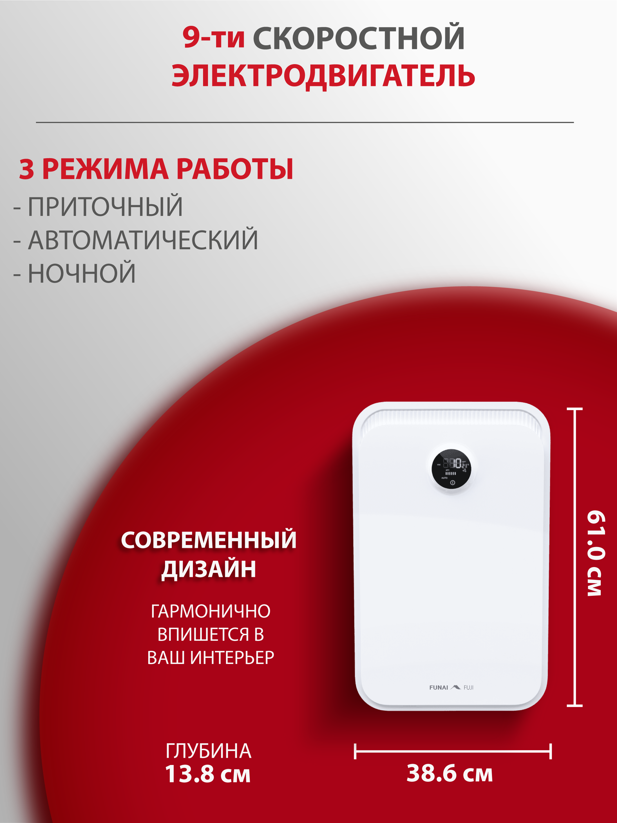 Ключевой фактор, формирующий комфортные условия для работы и отдыха — наличие в помещении полноценной приточно-вытяжной вентиляции. В тех случаях, когда централизованная вентиляция отсутствует либо ее производительности недостаточно, использование настенной приточно-вытяжной установки является оптимальным решением. FUNAI FUJI не только подает до 150 м3/ч свежего уличного воздуха, предварительно очищенного, нагретого в зимний период времени или охлаждённого — в летний, но также удаляет из помещения до 135 м3/ч загрязненного воздуха. Работа приточного и вытяжного вентиляторов происходит одновременно, а производительности достаточно для помещений площадью до 75 м2.