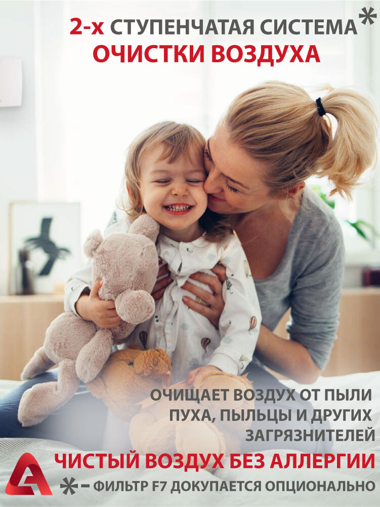 - 2-ступенчатая система очистки воздуха: предварительный сетчатый фильтр задерживает крупные частицы пыли, пуха, пыльцы, а фильтр тонкой очистки F7 (предоставляется опционально) улавливает мелкие частицы диаметром более 1 мкм с эффективностью 95%.